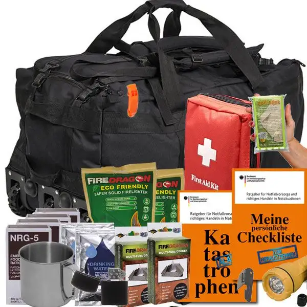 Der Notfall-Kampftrageseesack XL mit Rollen kombiniert extreme Robustheit, maximale Mobilität und ein umfangreiches Survival-Set in einem durchdachten Komplettpaket.